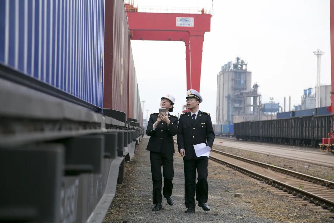 10点12分,宁波海关关员林厉頔、王璐瑶对出口至东盟的海铁联运货物进行监管。