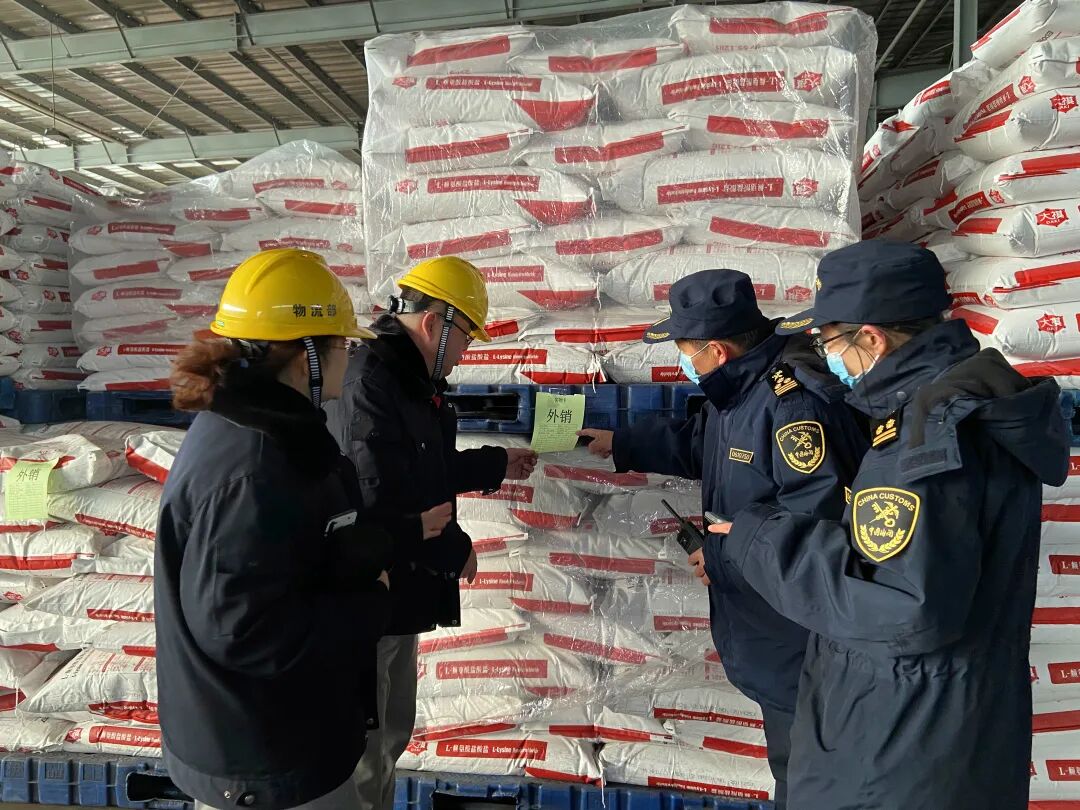 10点30分,满洲里海关所属赤峰海关关员郭道安 、闫琰对一批即将出口东盟的饲料添加剂进行查验。