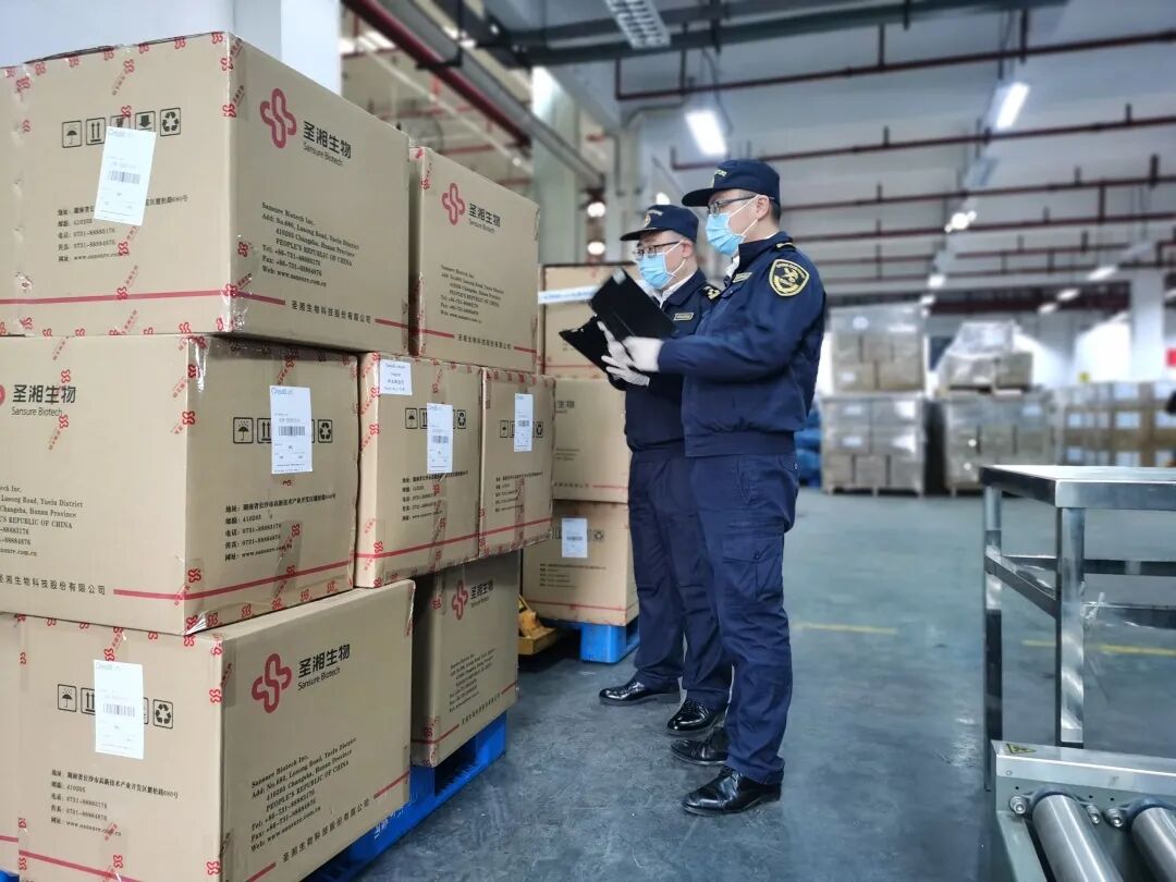 12点34分,长沙海关所属长沙黄花机场海关刘军舟(左一)、邹苗(左二)对发往东盟的新冠核酸检测试剂、细胞保存液等疫情防控物资进行查验。