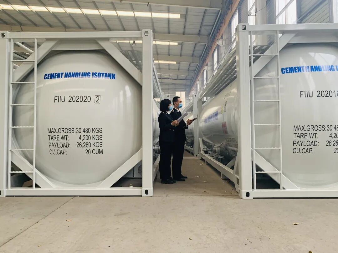 9点55分,石家庄海关所属黄骅港海关关员王友朋(右)、刘希芳(左)在河北宏泰专用汽车有限公司查验出口东盟的罐式集装箱。