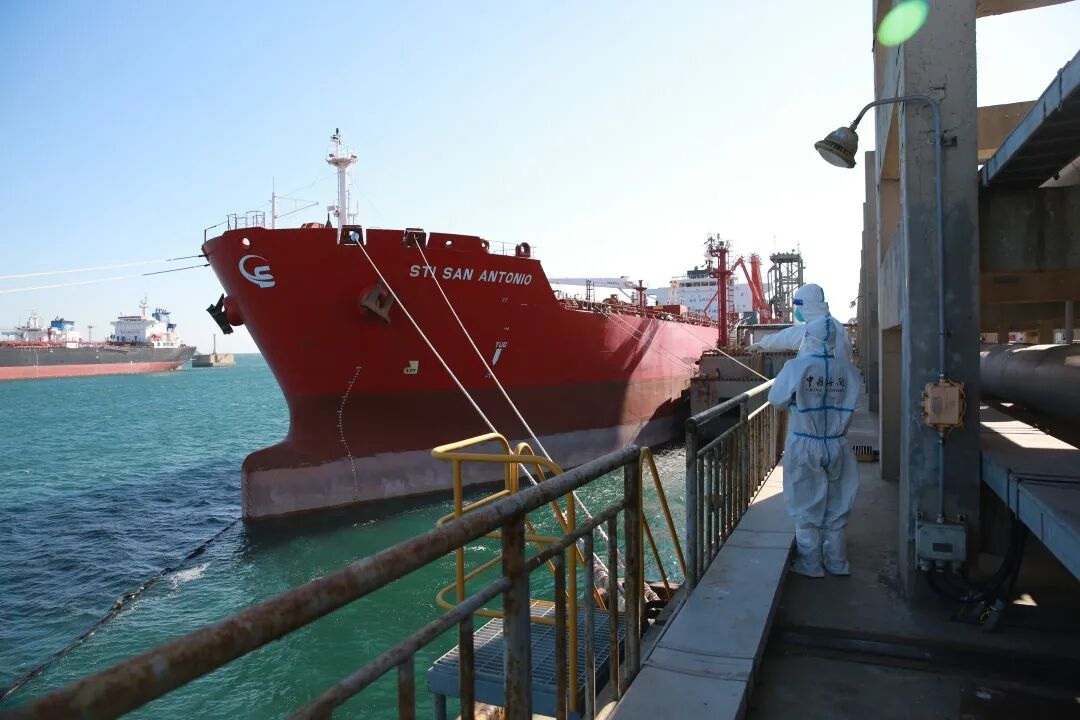 11点09分,大连海关所属北良港海关关员吴玲(左)、贾瑞雪(右)对出口东盟的38000吨汽油进行现场查验。
