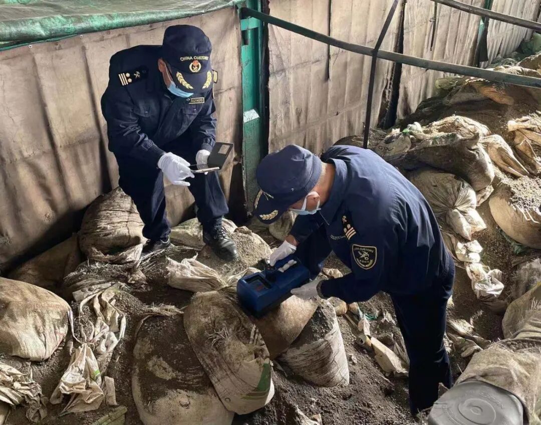 10点,昆明海关所属瑞丽海关关员赵卫东(左)、张永(右)在瑞丽口岸联检中心进口货场对东盟进口锡矿进行取样。