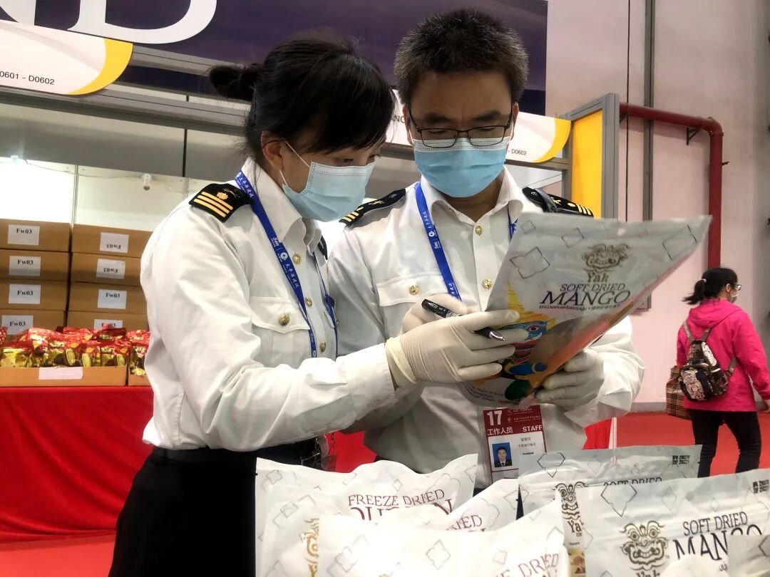14点16分,第17届中国—东盟博览会邕州海关驻会监管组现场关员梁朝军(右)、杨宇洁(左)在博览会现场开展巡馆相关工作。
