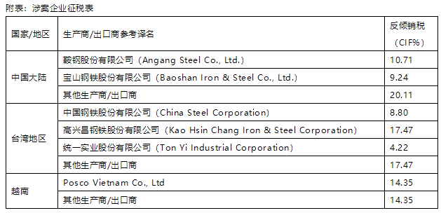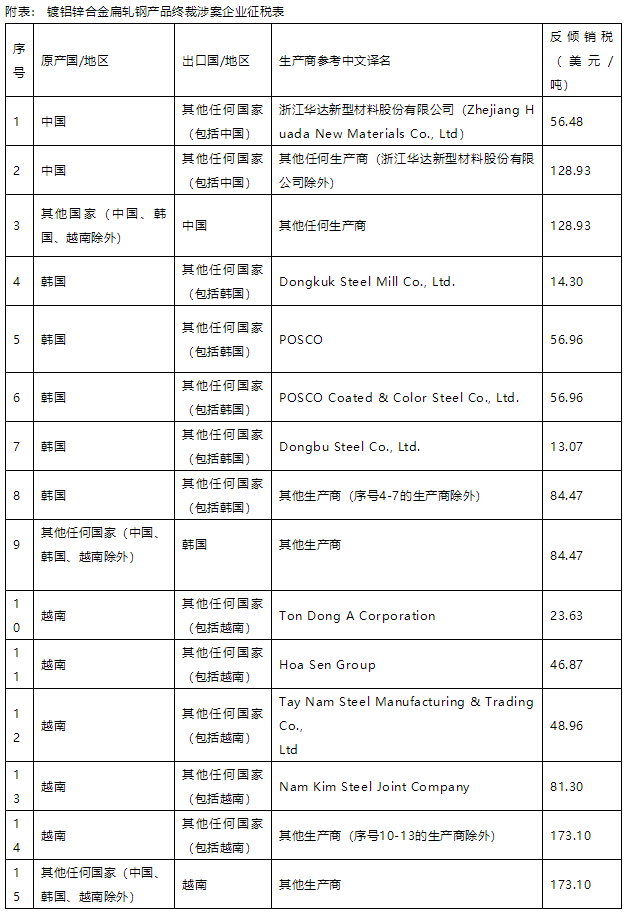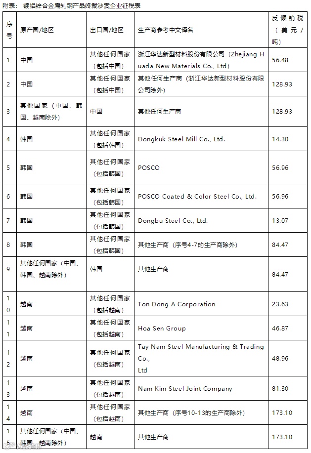 2020年2月21日,印度商工部发布公告称,对原产于或进口自中国、韩国和越南的镀铝锌合金扁轧钢产品(Aluminium and ZincCoated Flat Products)作出反倾销终裁:建议对上述国家的涉案产品征收反倾销税,具体措施见附表(镀铝锌合金扁轧钢产品终裁涉案企业征税表)。此次涉案产品的铝锌合金成分为含有一种或多种单独或组合不超过3%(按重量计)的附加元素。