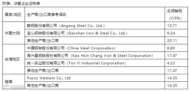 2019年4月2日,印度对原产于或进口自中国、韩国和越南的镀铝锌合金扁轧钢产品启动反倾销立案调查。2019年7月15日,印度商工部发布公告,对原产于或进口自中国、韩国和越南的镀铝锌合金扁轧钢产品作出反倾销肯定性初裁,建议对涉案产品征收临时反倾销税:中国涉案产品为68.08~129.59美元/吨,韩国为28.67~122.66美元/吨,越南为45.35~199.53美元/吨。