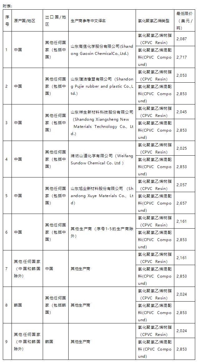 2020年2月19日,印度商工部发布公告称,对原产于或进口自中国和韩国的氯化聚氯乙烯(ChlorinatedPolyvinyl Chloride,简称CPVC)作出反倾销终裁:中国和韩国的涉案产品存在倾销行为,并对印度国内产业造成了实质性阻碍,且倾销与印度国内产业的实质性阻碍存在因果关系。因此,建议对上述国家的涉案产品征收为期5年的反倾销税,税额为进口商品报关价值(landedvalue,前提是低于最低限价)与最低限价(最低限价见附表)的差额部分。