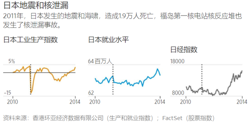 日本最初的经济反应是典型灾后做法:政府投入大量资金进行救援和重建,助推经济复苏。政府还投入资源重建该地区,截至2014年,其制造业生产已恢复到灾前水平。