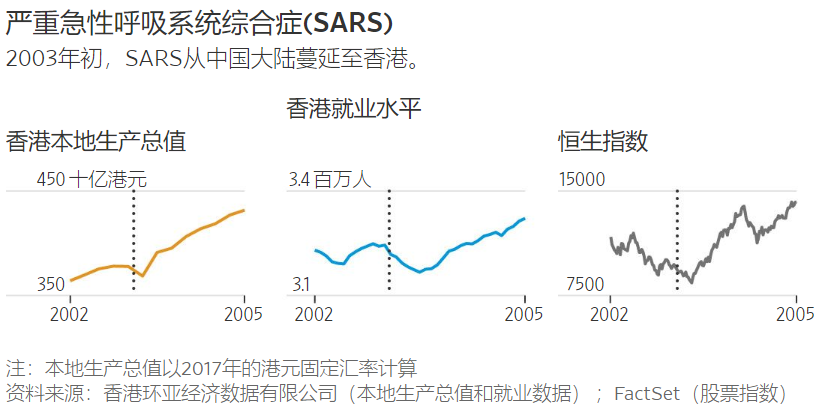 “对于非典病毒的恐惧感开始在整个香港蔓延,”香港大学经济学家萧如彬(Alan Siu)和王于渐(Y.C.Richard Wong)在2004年的一篇文章中写道,“口罩迅速脱销,到处都可以看到戴口罩的市民。公共场所每天消毒数次;人们更加频繁地洗手,尽量不去拥挤的地方;餐馆、商店、电影院和其他娱乐场无人光顾。”