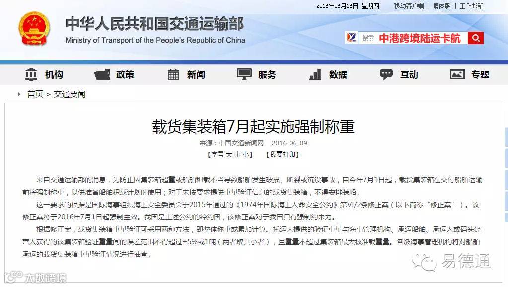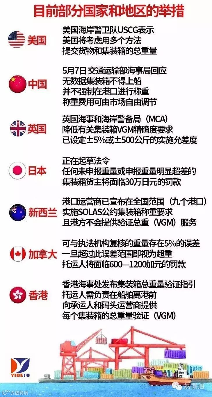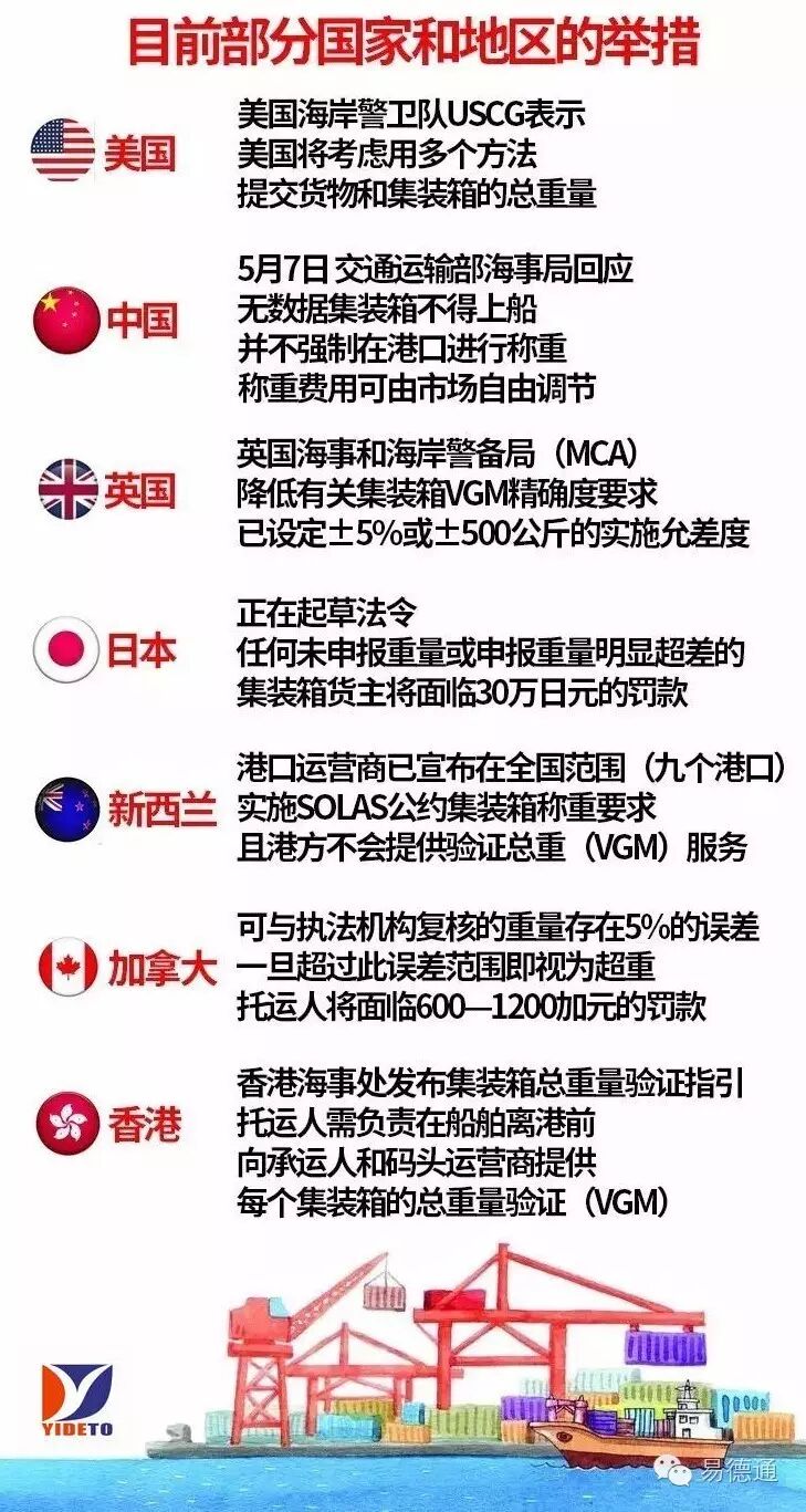 7月1日起,托运人将有义务以文件形式记录载货集装箱经核实的实际毛重;如在装船前未获得该数据,船长或其代理人和码头经营人可拒载。