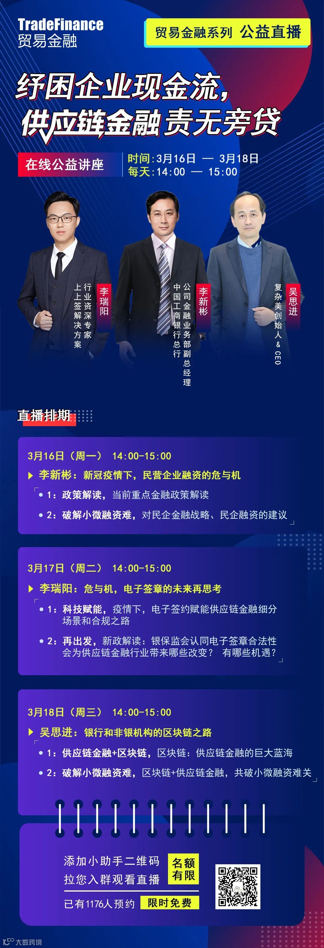 为大家详解"纾困企业现金流,供应链金融责无旁贷",各位大咖纷纷献计献策,精彩内容不停播,欢迎各位扫码预约。