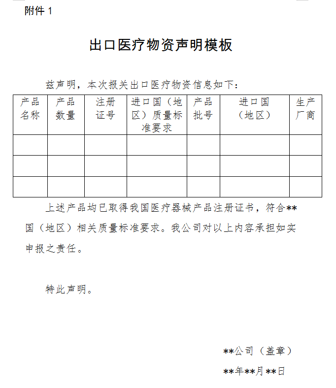 商务部 海关总署 国家药品监督管理局2020年第5号《关于有序开展医疗物资出口的公告》:自4月1日起,出口新型冠状病毒检测试剂、医用口罩、医用防护服、呼吸机、红外体温计的企业向海关报关时,须提供书面或电子声明,承诺出口产品已取得我国医疗器械产品注册证书,符合进口国(地区)的质量标准要求。海关凭药品监督管理部门批准的医疗器械产品注册证书验放。