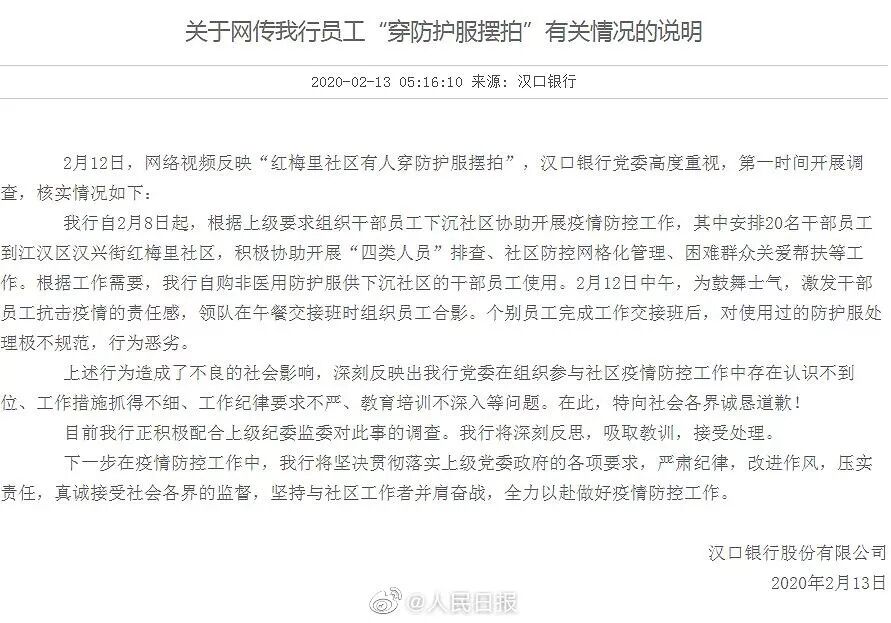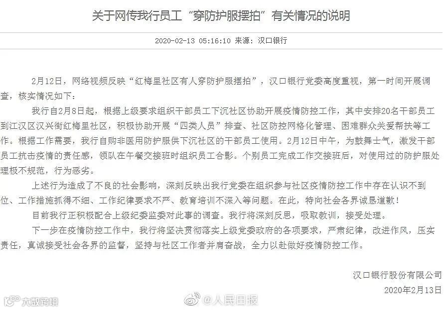 2月12日,网络视频反映“红梅里社区有人穿防护服摆拍”,汉口银行党委高度重视,第一时间开展调查,核实情况如下: