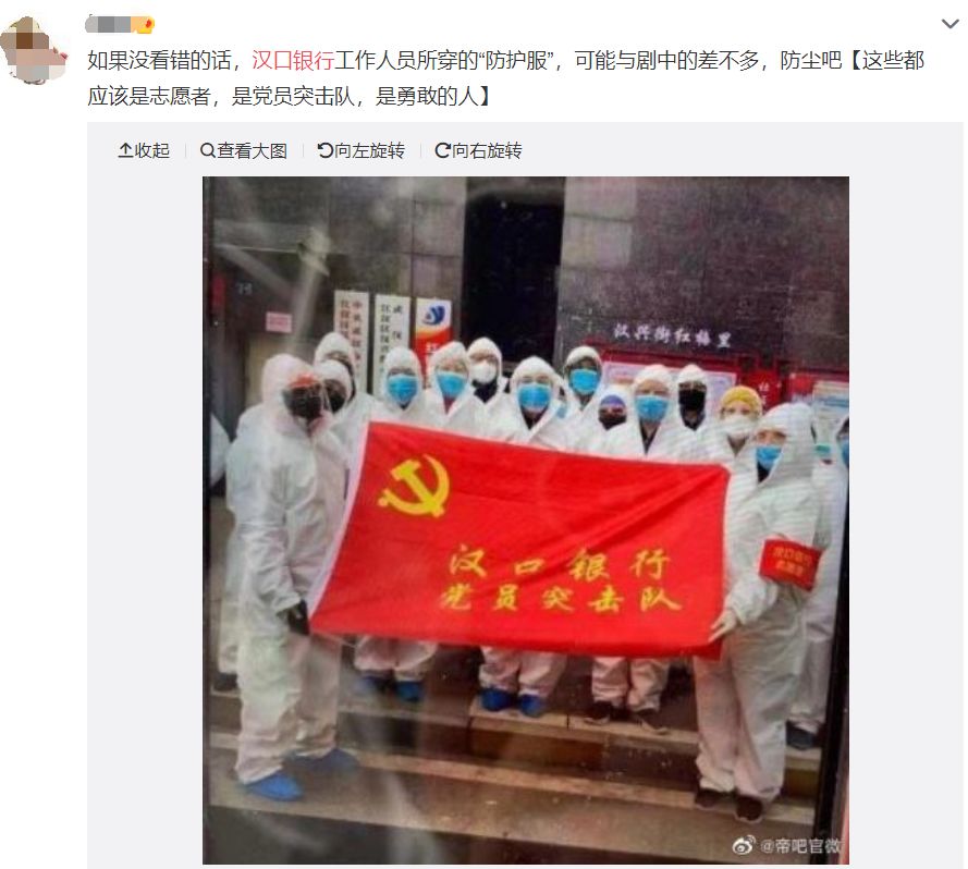 汉口银行称,根据工作需要,该行自购非医用防护服供下沉社区的干部员工使用。2月12日中午,为鼓舞士气,激发干部员工抗击疫情的责任感,领队在午餐交接班时组织员工合影。个别员工完成工作交接班后,对使用过的防护服处理极不规范,行为恶劣。