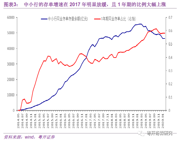 具体来说,一方面,2017-2018年,银保监会和央行将同业存单纳入至同业负债的统计范畴,并要求同业负债占银行总负债的比例不得高于三分之一,限制了银行发行同业存单扩张负债的规模,再加上现在省内监管机构对银行线下资金提出了不能出省的要求(省外的同业存款受限),银行再想利用同业负债扩张规模的难度明显加大,只能更加依靠一般性存款来扩张规模。