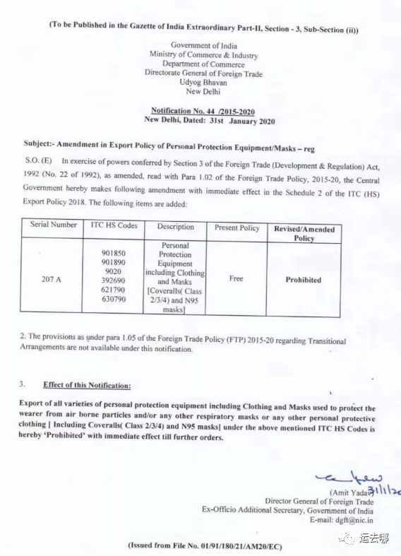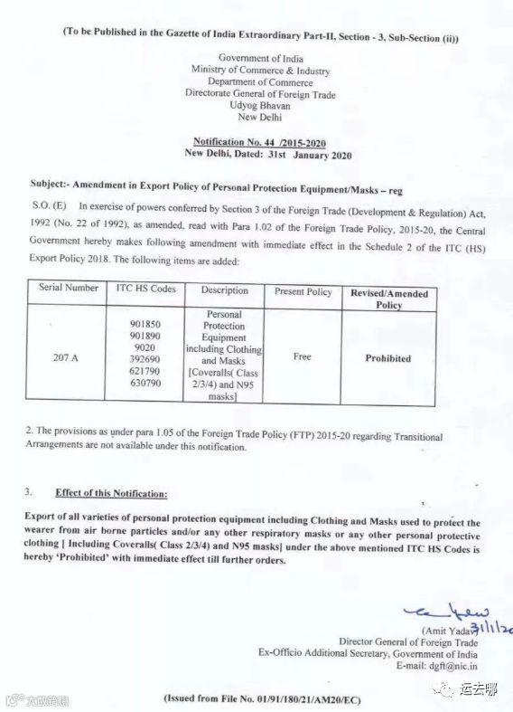 1月30日印度出现首例新型冠状病毒感染的肺炎确诊病例,1月31日印度政府发布公告,印度商工部外贸总局签发禁止任何口罩防护服等防疫用品,具体如下。