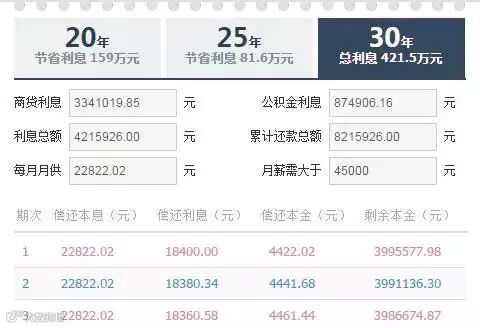 先来举个例子:地点坐标:北京,首付30% ,公积金和商业贷款混合贷款,公积金:4.05% 商业贷款:6.15%,公积金贷款120万,商业贷款280万,贷款400万。