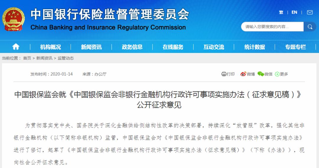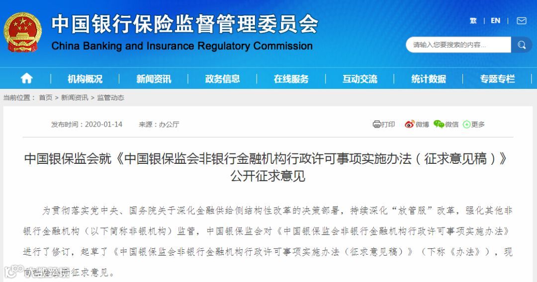 1月14日,银保监会官网发布消息:为贯彻落实党中央、国务院关于深化金融供给侧结构性改革的决策部署,持续深化“放管服”改革,强化其他非银行金融机构(以下简称非银机构)监管,中国银保监会对《中国银保监会非银行金融机构行政许可事项实施办法》进行了修订,起草了《中国银保监会非银行金融机构行政许可事项实施办法(征求意见稿)》(下称《办法》),现向社会公开征求意见。
