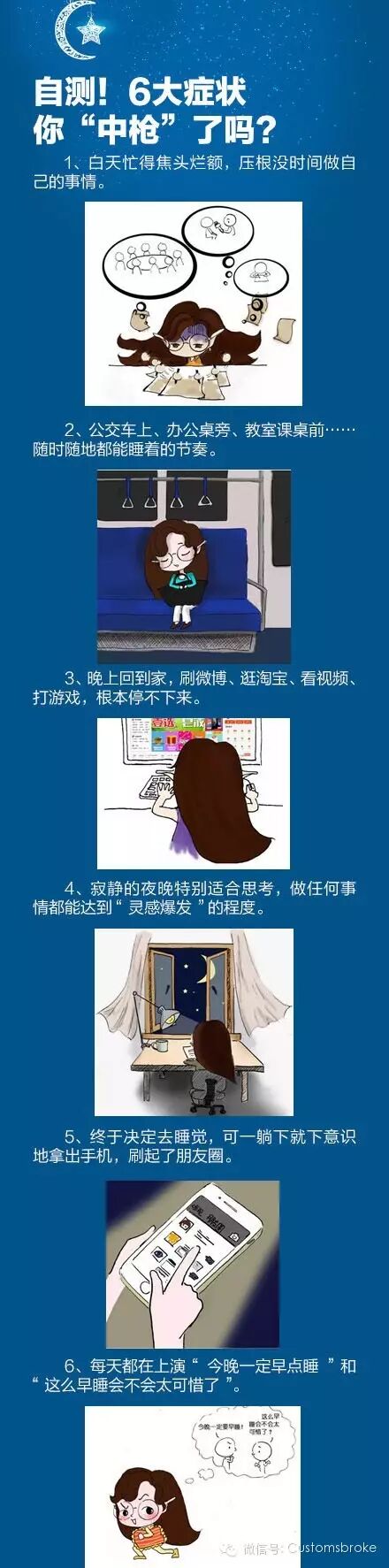 晚睡强迫症你有吗? ①白天忙得焦头烂额,没时间做自己的事;②公交车、办公桌、课桌前,随时能睡着;③回到家刷微博、看视频、打游戏停不下来;④夜晚做任何事都“灵感爆发”;⑤终于决定睡觉,可一躺下就刷朋友圈;⑥纠结“今晚一定早点睡”和“这么早睡会不会太可惜”。
