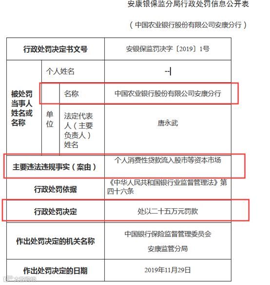 今天,银保监会官网公布的行政处罚信息公开表显示,中国农业银行安康分行因个人消费性贷款流入股市等资本市场被银保监会安康监管分局处以二十五万元罚款。