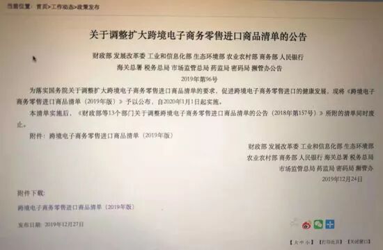 公告指出,为落实国务院关于调整扩大跨境电子商务零售进口商品清单的要求,促进跨境电子商务零售进口的健康发展,现将《跨境电子商务零售进口商品清单(2019年版)》予以公布,自2020年1月1日起实施。《财政部等13个部门关于调整跨境电子商务零售进口商品清单的公告(2018年第157号)》所附的清单同时废止。