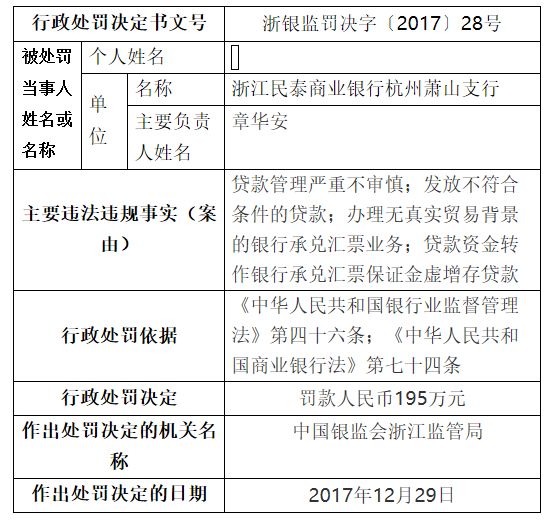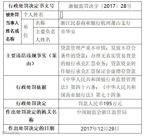 这张文号为浙银监罚决字〔2017〕28号的罚单显示,民泰银行萧山支行因贷款管理严重不审慎、发放不符合条件的贷款、办理无真实贸易背景的银行承兑汇票业务、贷款资金转作银行承兑汇票保证金虚增存贷款,被罚195万元。沈新军、吴强分别对上述违规行为负有直接领导责任和直接责任,均被处以禁止终身从事银行业工作。