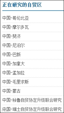 正在研究的自贸区有中国—哥伦比亚、中国—摩尔多瓦、中国—斐济、中国—尼泊尔、中国—巴新、中国—加拿大、中国—孟加拉、中国—毛里求斯、中国—蒙古、中国—秘鲁自贸协定升级联合研究、中国—瑞士自贸协定升级联合研究。