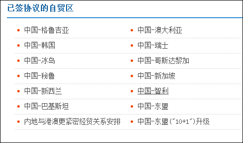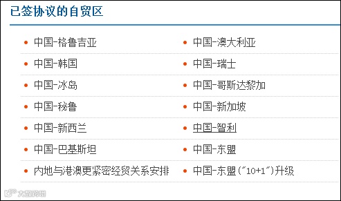 具体来看,已签协议的自贸区有中国—格鲁吉亚、中国—韩国、中国—冰岛、中国—秘鲁、中国—新西兰、中国—巴基斯坦、中国—澳大利亚、中国—瑞士、中国—哥斯达黎加、中国—新加坡、中国—智利、中国—东盟等。