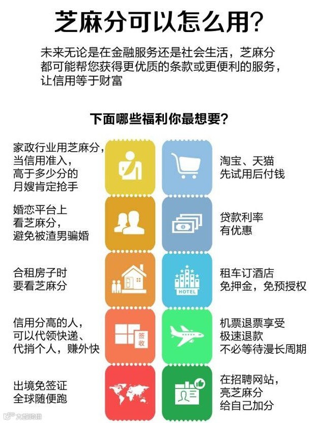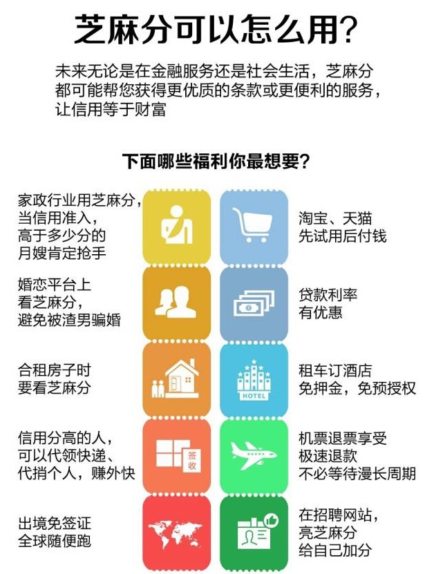 据透露,公测期间芝麻信用已经跟租车、租房、婚恋、签证等多个领域的合作伙伴谈定了合作,并将很快试验性地对外提供服务。这意味着当你的芝麻分达到一定数值,租车、住酒店时可以不用再交押金,网购时可以先试后买,办理签证时不用再辗转腾挪办存款证明,贷款时可以更快得到批复、拿到比别人低的利率等。
