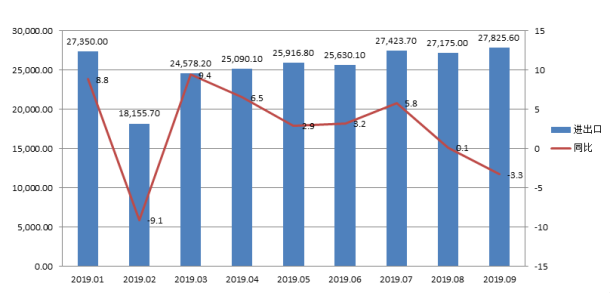 据海关统计,今年前三季度我国外贸进出口总值22.91万亿元人民币,比去年同期增长2.8%。总的看,前三季度,我国外贸运行呈现了总体平稳、稳中提质的态势。