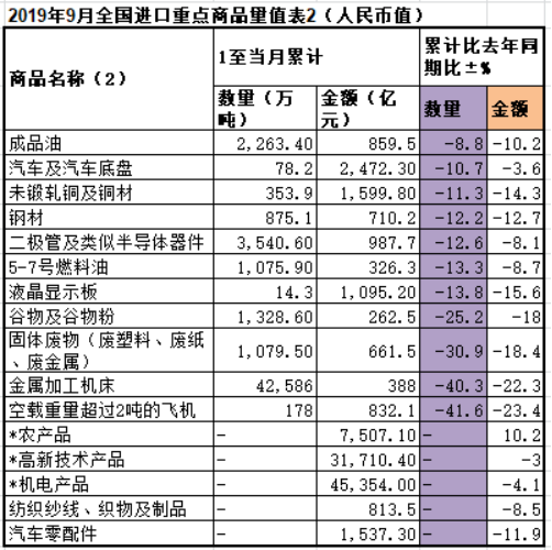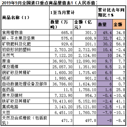 从进口商品看,原油、煤等大宗商品进口量增加,猪肉、牛肉等进口量增幅较大。前三季度,我国进口原油3.69亿吨,增加9.7%;煤2.51亿吨,增加9.5%;天然气7122.2万吨,增加10%。此外,进口铁矿砂7.84亿吨,减少2.4%;大豆6451.1万吨,减少7.9%。同期,进口猪肉132.6万吨,增加43.6%;进口牛肉113.2万吨,增加53.4%。