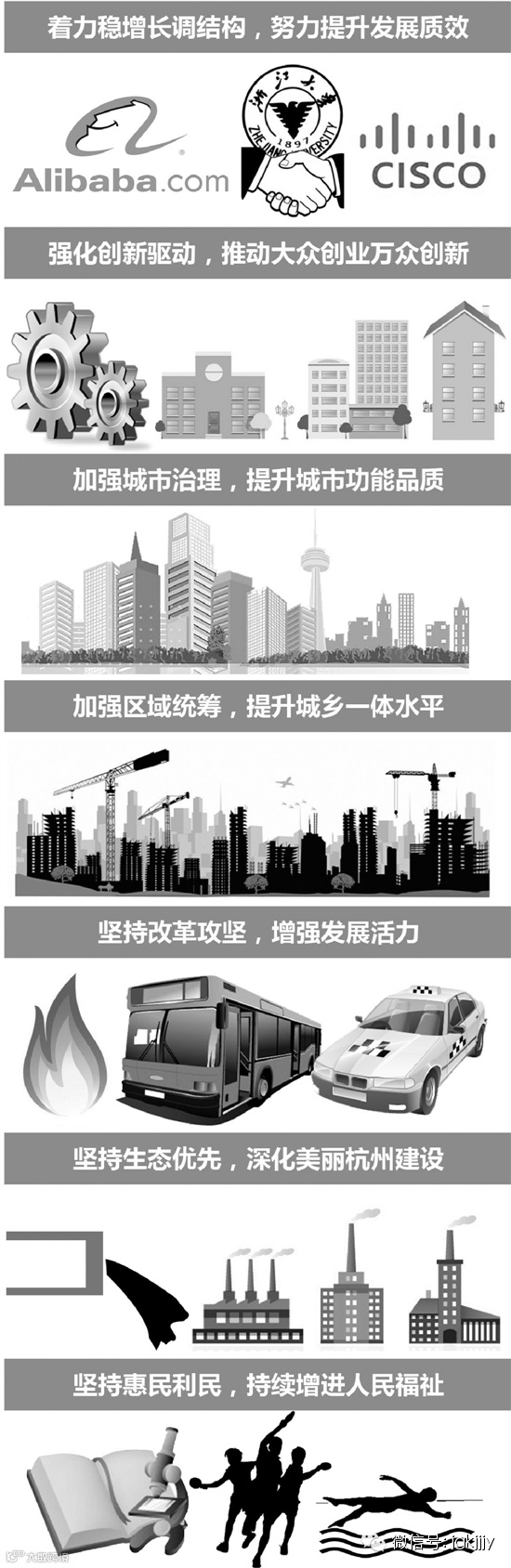 ●着力稳增长调结构,努力提升发展质效。比如,深化与阿里巴巴、浙江大学、思科等名企名院名校战略合作,深化市民卡、阿里云、华数等智慧化应用,加快“六大中心”建设,打造万亿级信息经济产业集群。