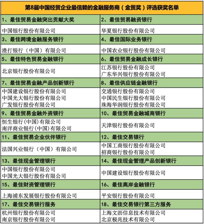 “第8届中国经贸企业最信赖的金融服务商(金贸奖)”评选获奖名单