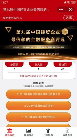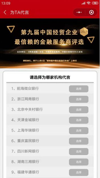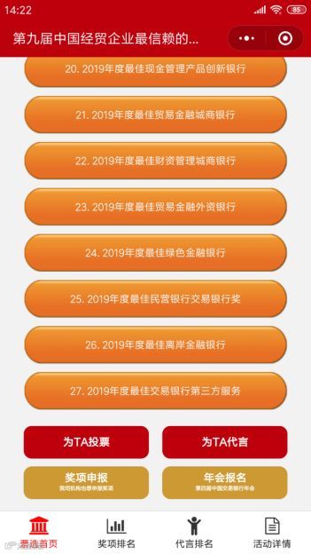 拉票规则:您可以选择您中意的银行、企业,生成专属海报分享到朋友圈,为您中意的银行拉票,小程序将显示奖项排行榜及拉票排行榜