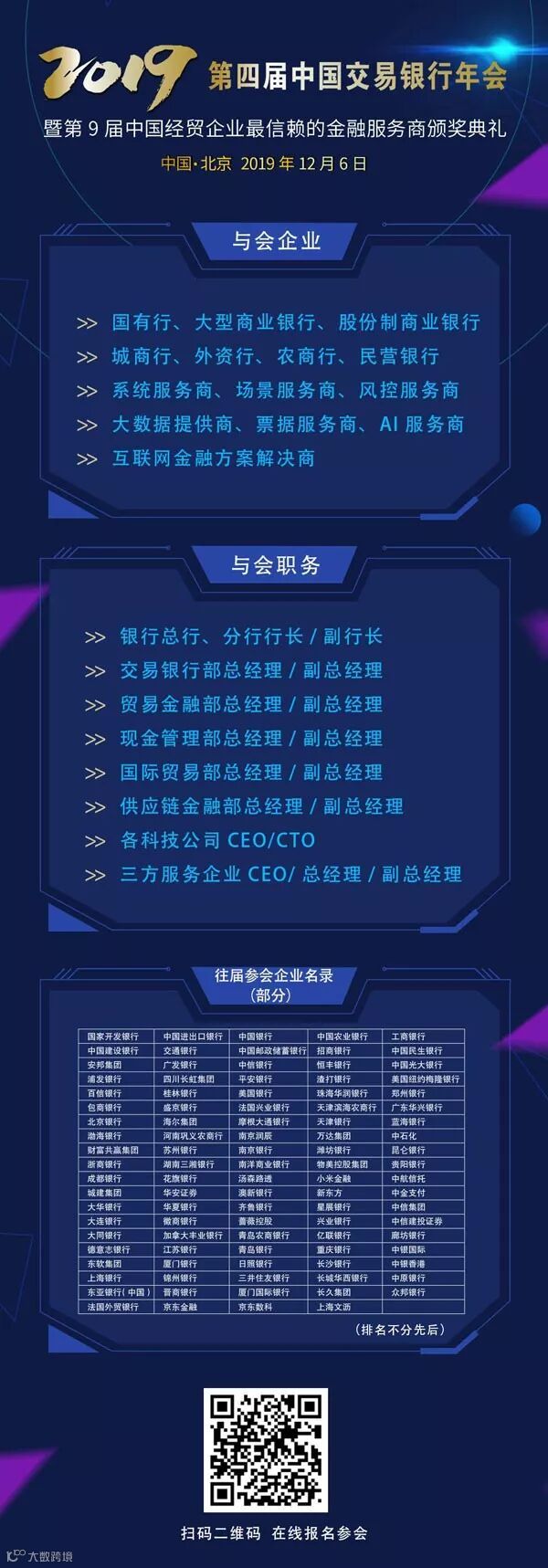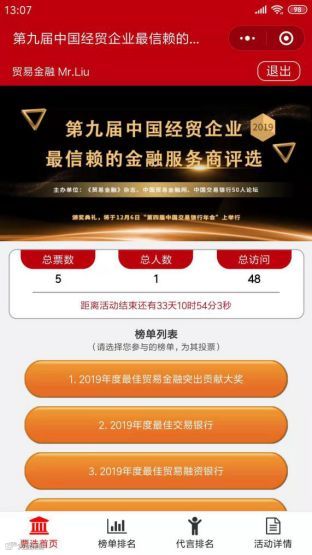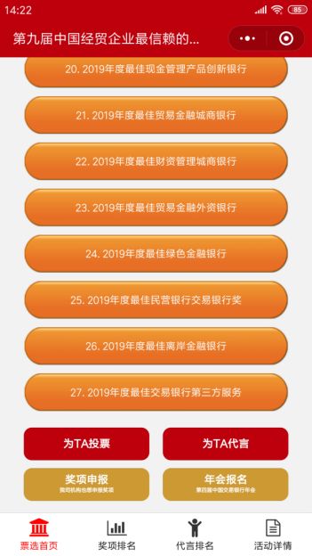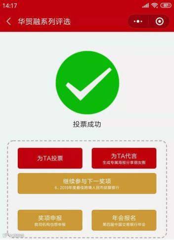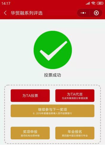 您可以在“贸易金融”、“财资和供应链研究院”、“交易金融”等数十个微信公众号、中国交易银行年会官网、中国贸易金融网、中国财资管理网等线上渠道进行评选投票。本次评选将经历“线上评选、机构自评、专家评审”三个阶段,最终获奖机构名单,将会在“12月6日,第四届中国交易银行年会”上进行公布并举行颁奖典礼。