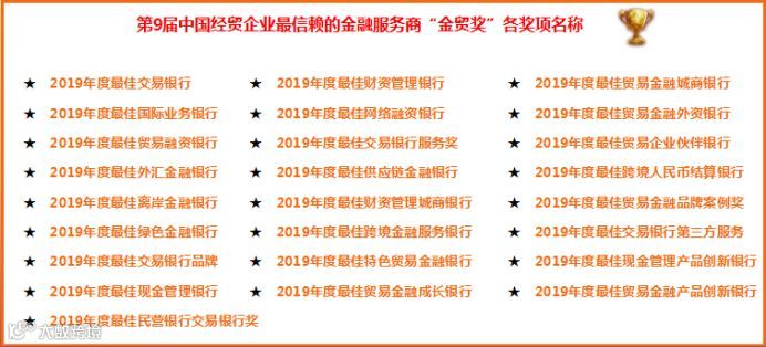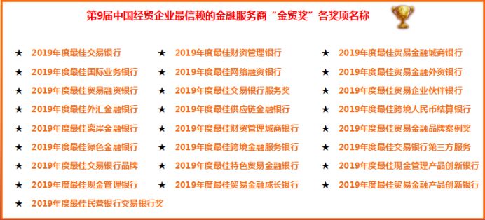 作为业内最知名的交易银行生态圈奖项之一,中国经贸企业最信赖的金融服务商“金贸奖”从2010年举办至今,已经走过了9个年头。在《贸易金融》杂志、中国贸易金融网的鼎力支持下、“第九届中国经贸企业最信赖的金融服务商评选”活动如期而至,此次评选旨在通过一年一度的评选,以期表彰先进、树立标杆、分享价值,从而带动整个交易银行行业的持续、稳步发展。
