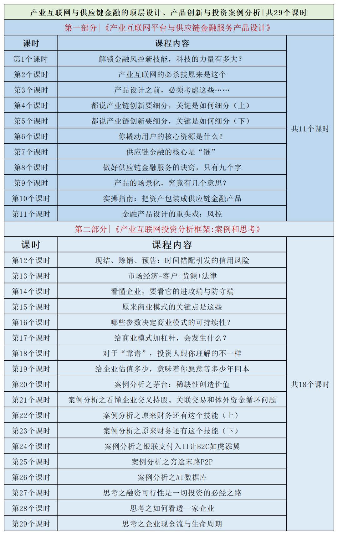 《产业互联网与供应链金融的顶层设计、产品创新与投资案例分析》22小时PPT视频课程由《贸易金融》杂志联合行业专家在成功举办了100+场线下培训及上百家供应链机构的基础上,基于整理和讲课的形式,将供应链金融行业干货内容精心提炼出来。