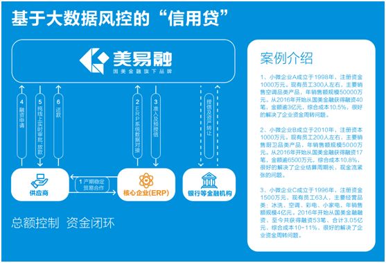 ② 小微企业B成立于2010年,注册资本1000万元。现有员工200人左右,主要销售厨卫品类产品,年销售额规模5000万元。从2016年开始从国美金融获得融资17笔,金额逾6500万元,综合成本10.8%,很好的解决了企业结算周期长,现金流紧张的问题。
