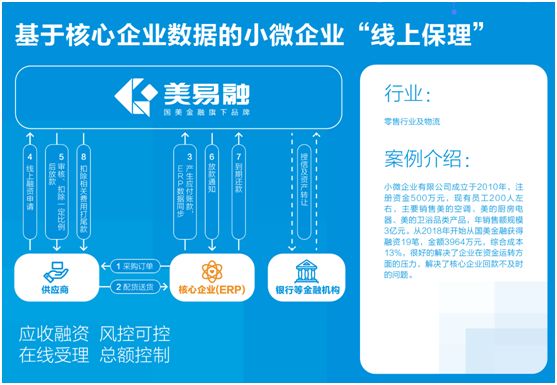 ④ 小微企业有限公司成立于2010年,注册资金500万元,现有员工200人左右,主要销售美的空调、美的厨房电器、美的卫浴品类产品,年销售额规模3亿元。从2018年开始从国美金融获得融资19笔,金额3964万元,综合成本13%,很好的解决了企业在资金运转方面的压力,解决了核心企业回款不及时的问题。