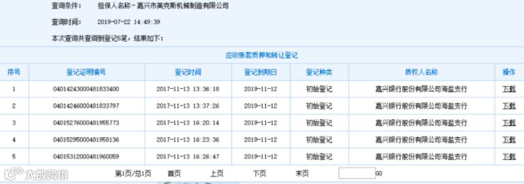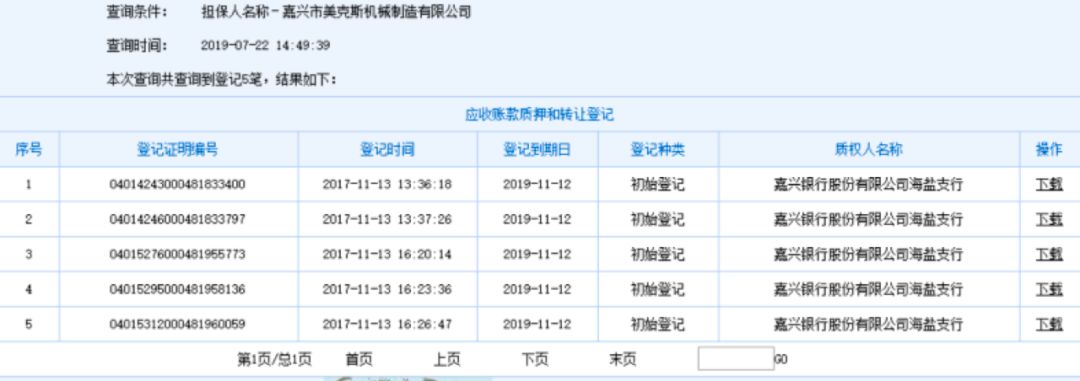 掌链在动产融资统一登记系统里以担保人名称为查询条件,看到系统里共登记有五项应收账款质押登记,登记时间均为2017年11月13日,其中1、2、5项里的贷款本金分别对应前述的三笔贷款,3、4项与1、2项分别所涉贷款本金相同,但不同的是,在登记表格里的质押财产信息附件一栏中,3、4、5项都填写了一张名为《应收账款余额明细》的图,图片里列出的是美克斯机械公司对杭氧钢结构等28家公司、合计约6725万元的应收账款明细。