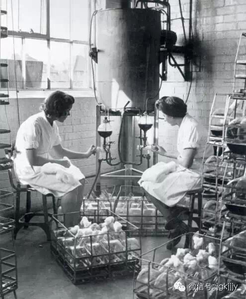 图为1943年,药剂师正在向培养瓶中倒入适宜青霉素霉菌生长的培养液。