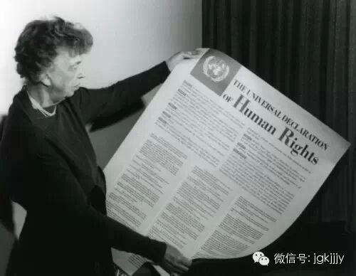 图为埃莉诺·罗斯福正拿着其协助起草的《世界人权宣言》阅读。
