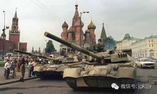 图为推翻苏联前总统米哈伊尔戈尔巴乔夫的统治后,苏联军方坦克停在莫斯科红场中的场景。