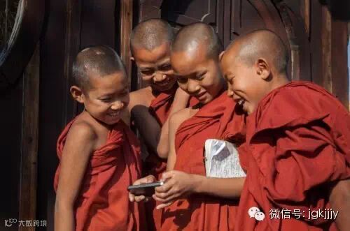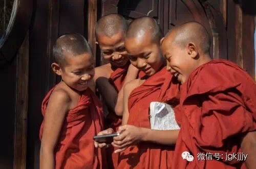 图为缅甸蒲甘,年轻的僧侣们聚集在一块玩智能手机的景象。