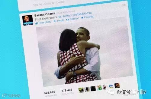图为巴拉克?奥巴马(Barack Obama)再次当选为美国总统后,在2012年11月7日于罗马发布的推特。