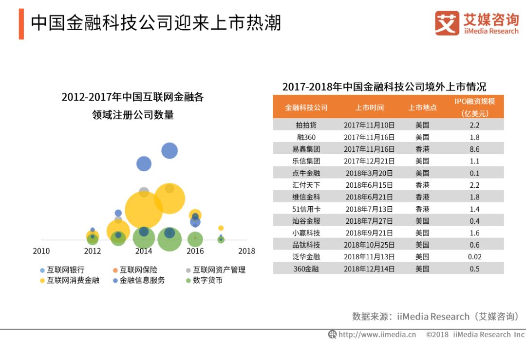 2017年11月到2018年,中国金融科技公司迎来五年来第二次上市热潮。根据艾媒咨询的不完全统计,截至2018年12月,近一年在境外证券市场上市的公司有13家,首次公开发售的融资规模接近25亿美元。公司IPO最大规模达8.6亿美元。