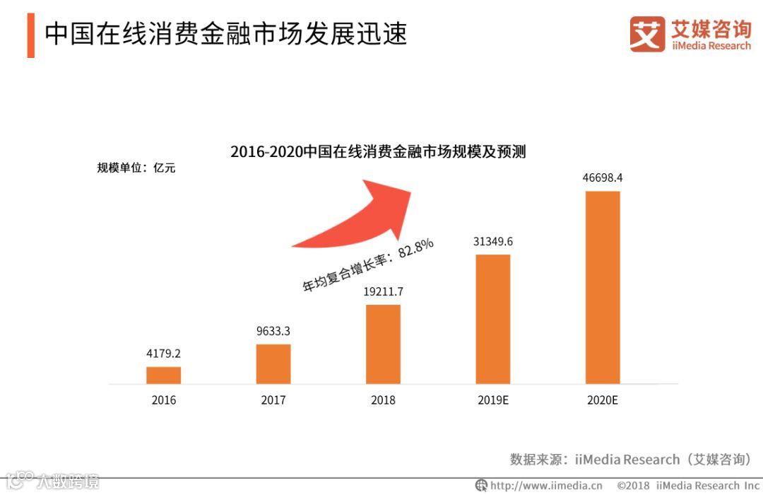 数据显示,中国在线消费金融市场近年发展迅速,根据2016-2020年在线消费金融市场规模和预测结果,预计消费金融市场规模年均复合增长率为82.8%;2018年市场规模为19211.7亿元,2019年更有望突破30000亿元关口。