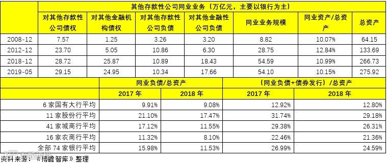 经过包商银行事件的冲击,同业刚性兑付已明确被打破,经过央行、银保监会等采取各类手段进行同业增信,但手段均属于短期,显示出这也是政策层面的导向。未来一段时期内,同业业务萎缩是显而易见的趋势和市场共识。我们以宽口径来计算的话(即主要由银行构成的其他存款性公司),2019年5月底其它存款性公司的同业业务规模达到54.10万亿元,占总资产的比例约为10%附近,最高时也约为15%左右,因此10-15%左右应是同业业务占比的平均水平区间。