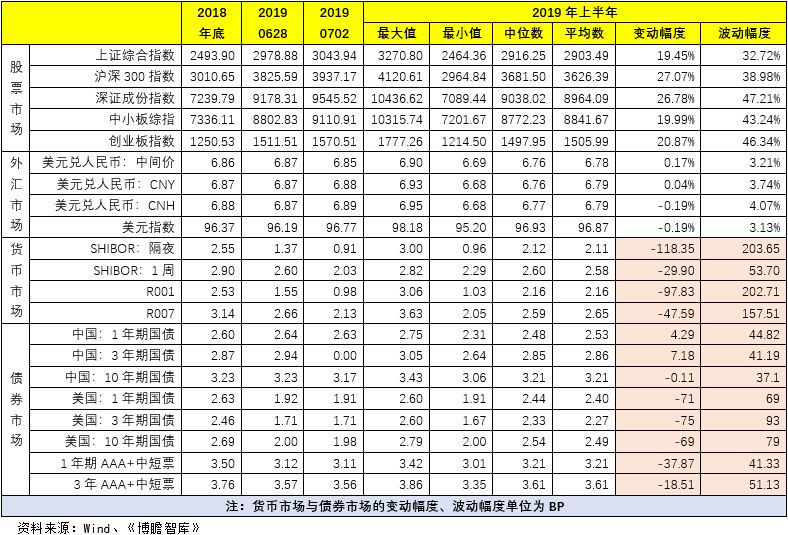 整体上看,今年上半年经济转弱的特征还是比较明显,特别是进入二季度后这一特征尤其突出(一季度天量社融指标形成明显扰动)。同时考虑到二季度5月5日的中美贸易战重启、5月24日的某银行被接管等内外事件的影响,货币市场和债券市场受到短暂冲击后,出现资金面超预期宽松、收益率显著下行的情况。不过在这一系列事件的冲击下,上半年中国股市大幅上扬、汇率与利率债收益率重回年初水平,而美国国债收益率与中国信用债收益率则大幅下行。