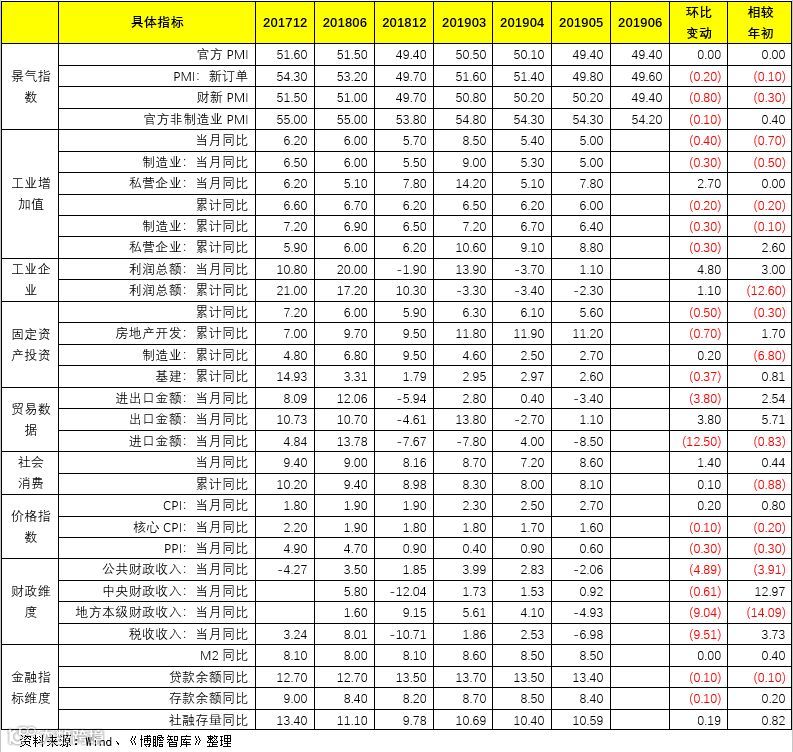 1、上半年整体来看,略有好转的指标主要有官方非制造业PMI(上升0.4个百分点);私营企业工业增加值累计同比(上升2.60个百分点)、全部工业企业利润总额当月同比(上升3个百分点);房地产开发投资累计同比(上升1.70个百分点)、基建投资累计同比(上升0.81个百分点);进出口当月同比(上升2.54个百分点)、出口金额当月同比(5.71个百分点)、社会消费当月同比(0.44个百分点)、CPI当月同比(上升0.80个百分咪);中央财政收入当月同比(上升12.97个百分点)、税收收入当月同比(上升3.73个百分点);M2同比(上升0.40个百分点)、存款余额同比(上升0.20个百分点)、社融存量同比(上升0.82个百分点)。