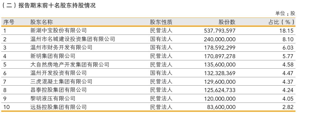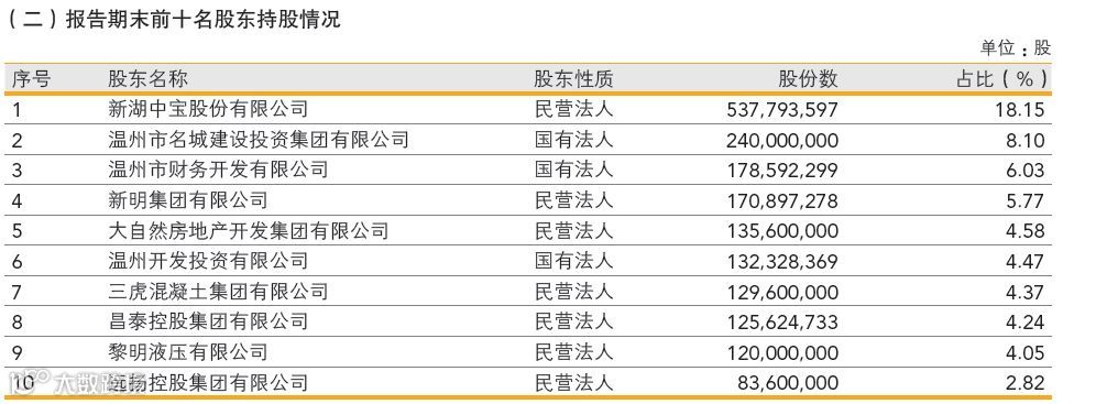 报告期末,该行前十大股东为:新湖中宝股份有限公司,持股占比18.15%;温州市名城建设投资集团有限公司,持股占比8.1%;温州市财务开发有限公司,持股占比6.03%;新明集团有限公司,持股占比5.77%;大自然房地产开发集团有限公司,持股占比4.58%;温州开发投资有限公司,持股占比4.47%;三虎混凝土集团有限公司,持股占比4.37%;昌泰控股集团有限公司,持股占比4.24%;黎明液压有限公司,持股占比4.05%;远扬控股集团有限公司,持股占比2.82%。上述前十大股东中,涉及房地产和建筑业的公司多达8家。